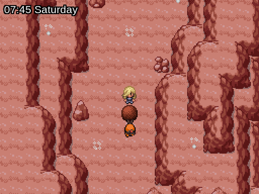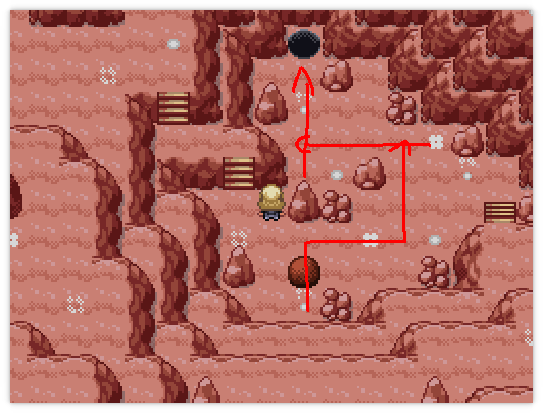 You need to push the boulder into the hole. It's pretty easy to screw yourself here, so save beforehand and then follow the red arrow to push it. Jump down into the hole yourself to find... a Tepig? If you talk to it, it runs away, all the way down to B1F: now you should go and find that Strength boulder you remembered. If you push it out of the way, you'll find the Tepig again, as well as TM37 Sandstorm.