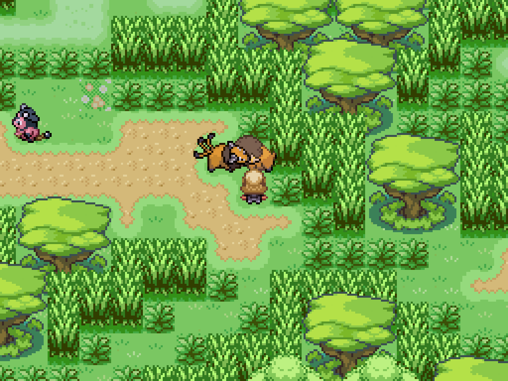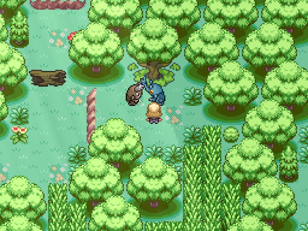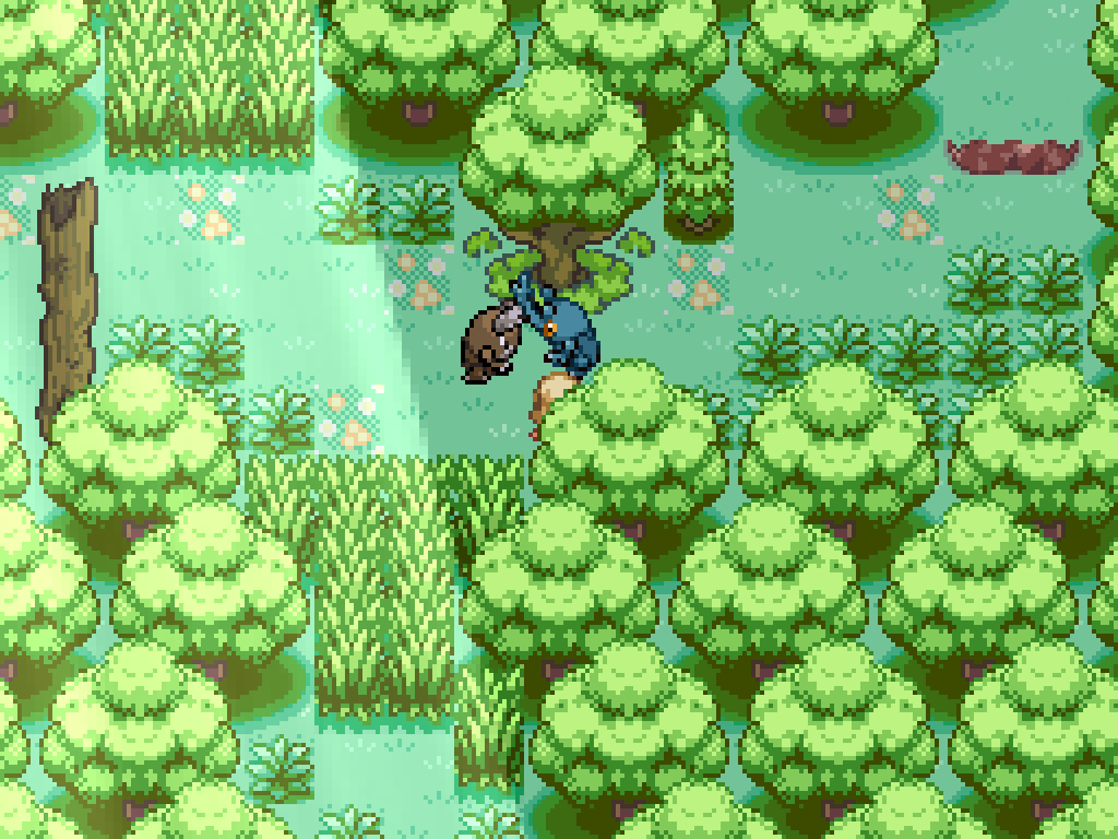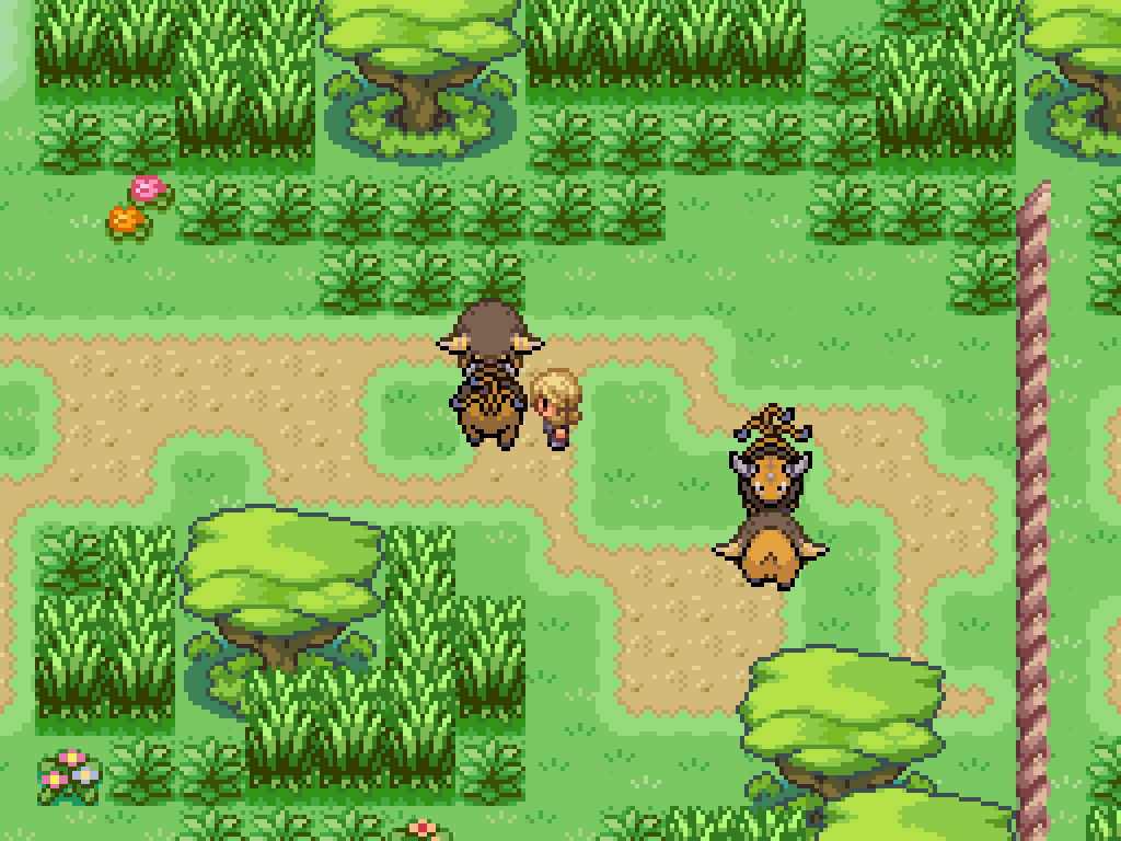 Above the third exit to the southern woods is two pairs of fighting Pokémon. First, kill this Tauros to have Bouffalant move a log. Ignore the other pair for now and return to the pair above the second exit.