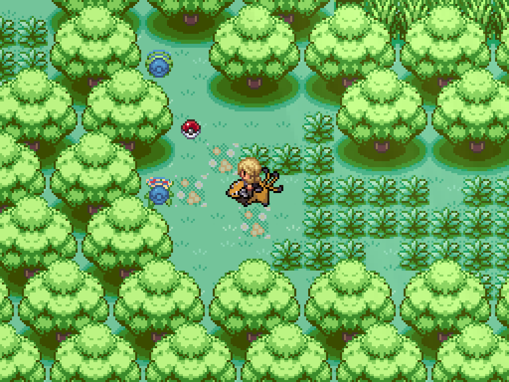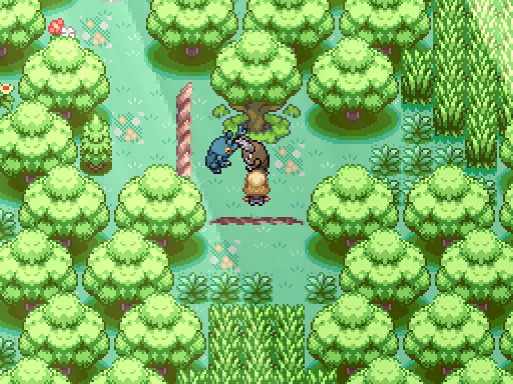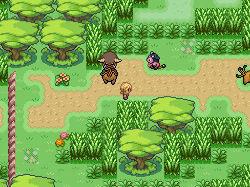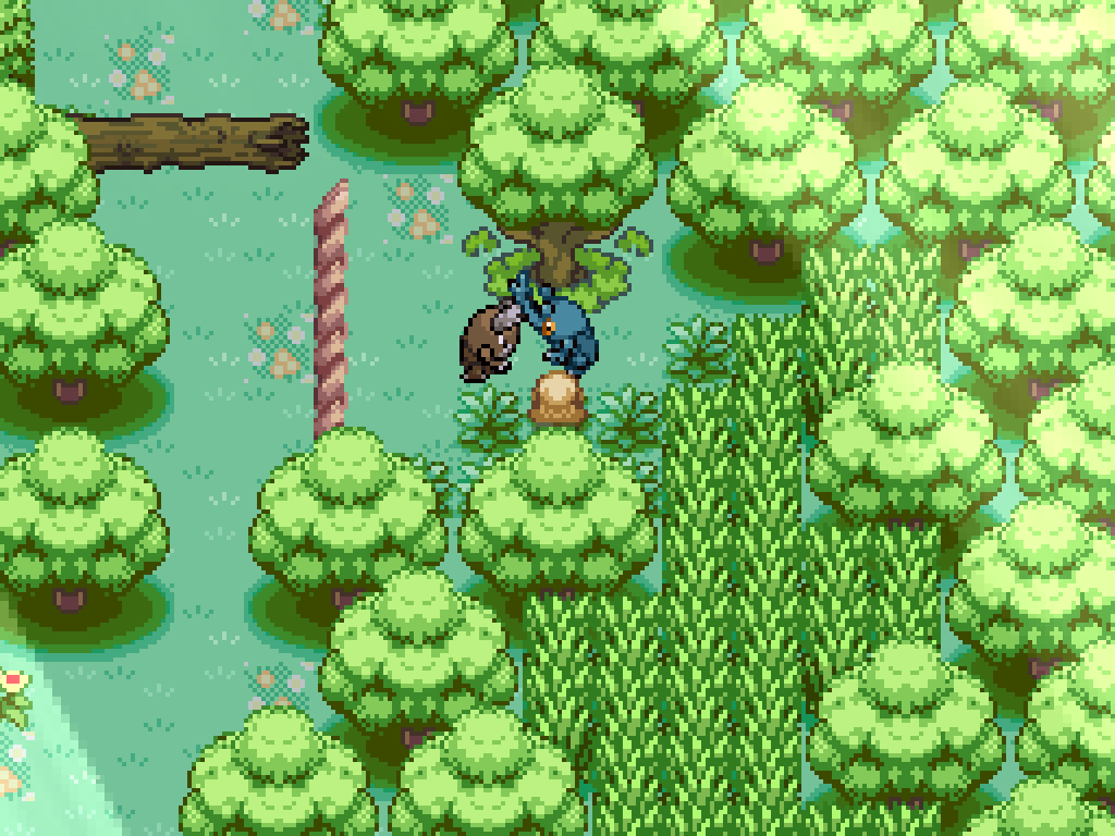 Above the third exit to the southern woods is two pairs of fighting Pokémon. First, kill this Tauros to have Bouffalant move a log. Ignore the other pair for now and return to the pair above the second exit.