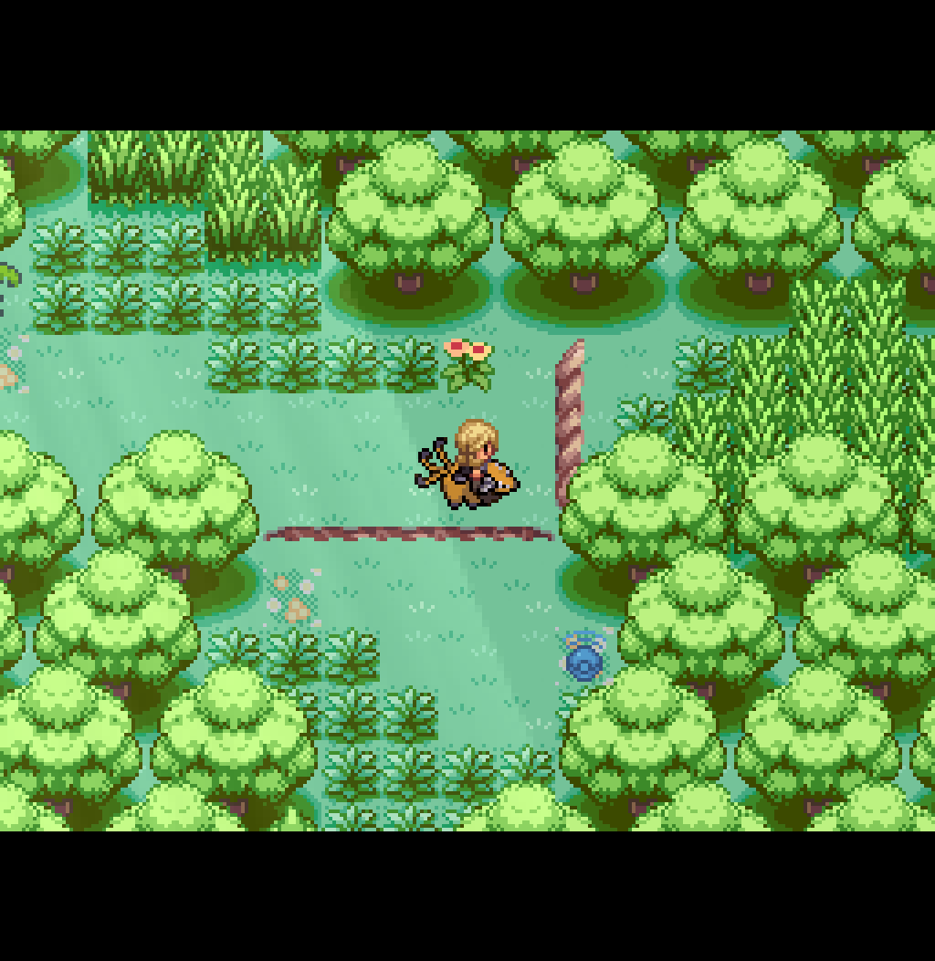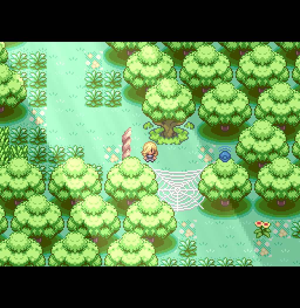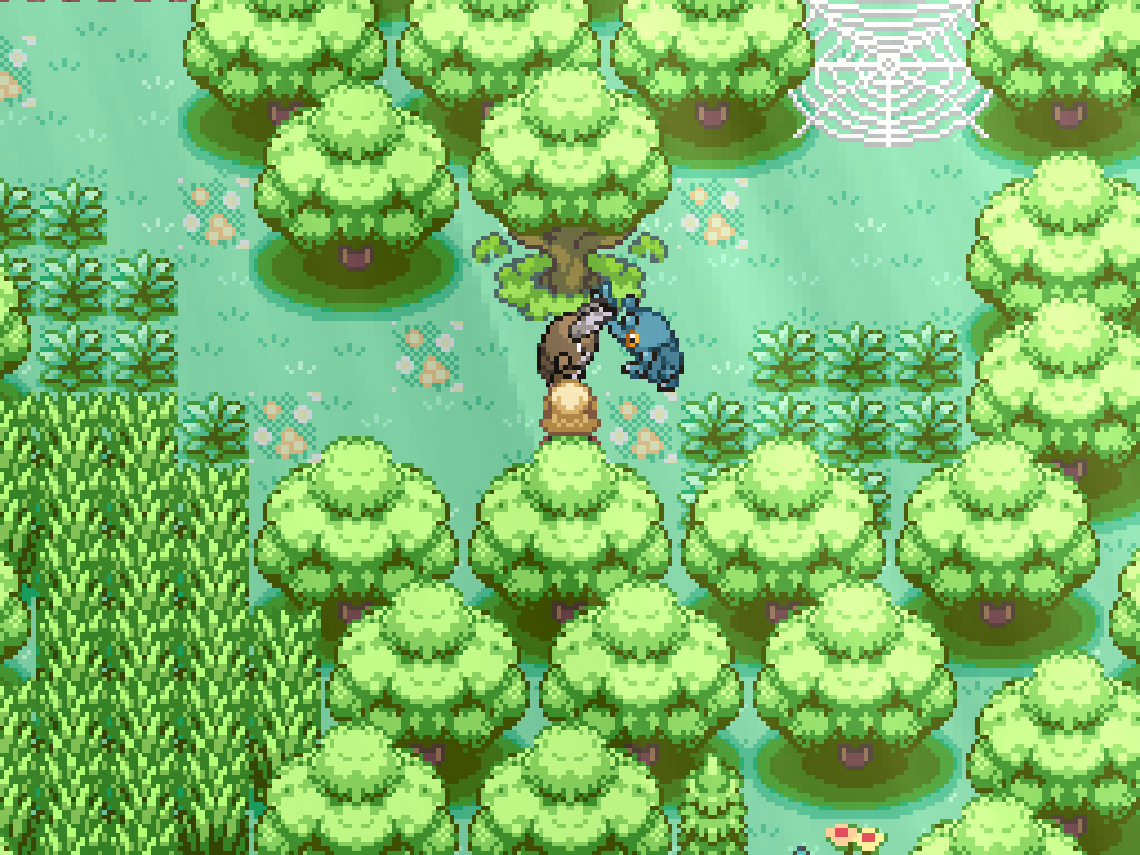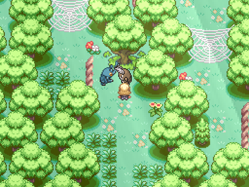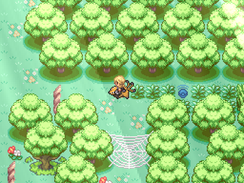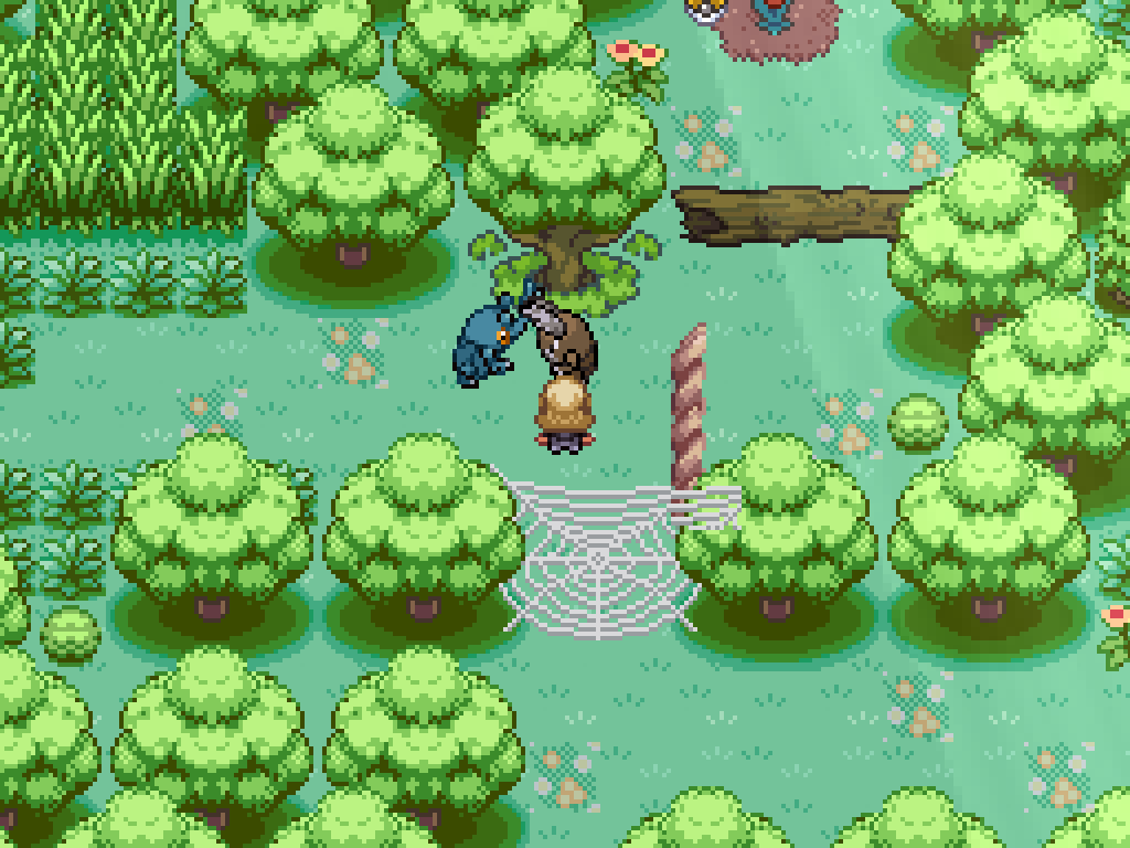 If you interact with this honey tree, you can use a single honey item to spawn a bug pair. Kill the Pinsir to have Heracross destroy the spiderweb. This opens the path from the second exit. Step on one of the flowers to reset Route 1.