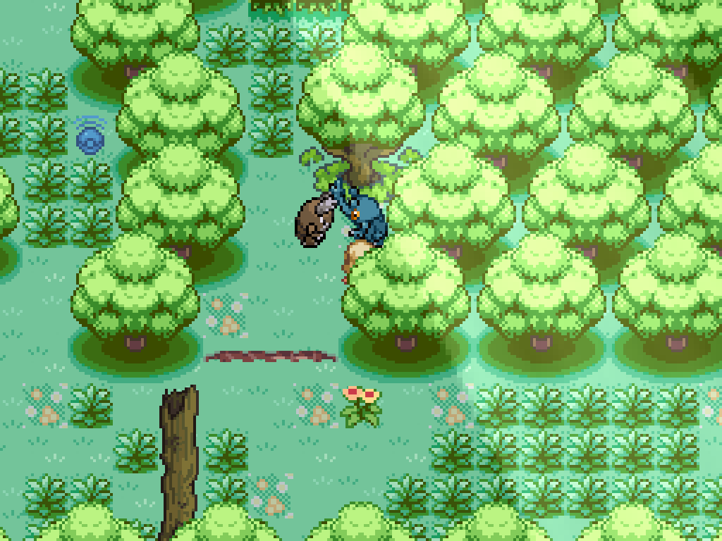 Near the 4th exit, spawn the bug pair with this tree and then kill Pinsir to have Heracross destroy the spider web. Walk down and exit through the fifth exit, then travel upwards and kill the Tauros to have Bouffalant move the log below. With the log gone, you can walk from the fourth to the area above the ledge from the fifth exit (or, use a Tauros) and then up through the tall grass.