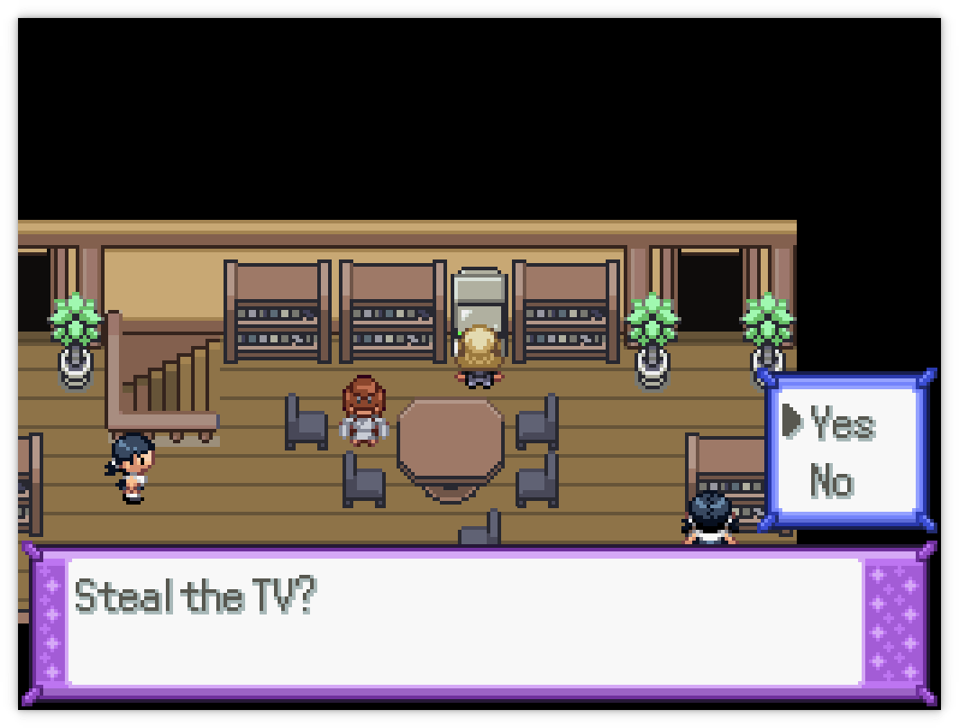 Your heist target is immediately upstairs; interact with the TV to steal it. Somebody else will try and battle you to stop you; after beating her, you can bring the TV back to the first girl to get your fifth sticker.